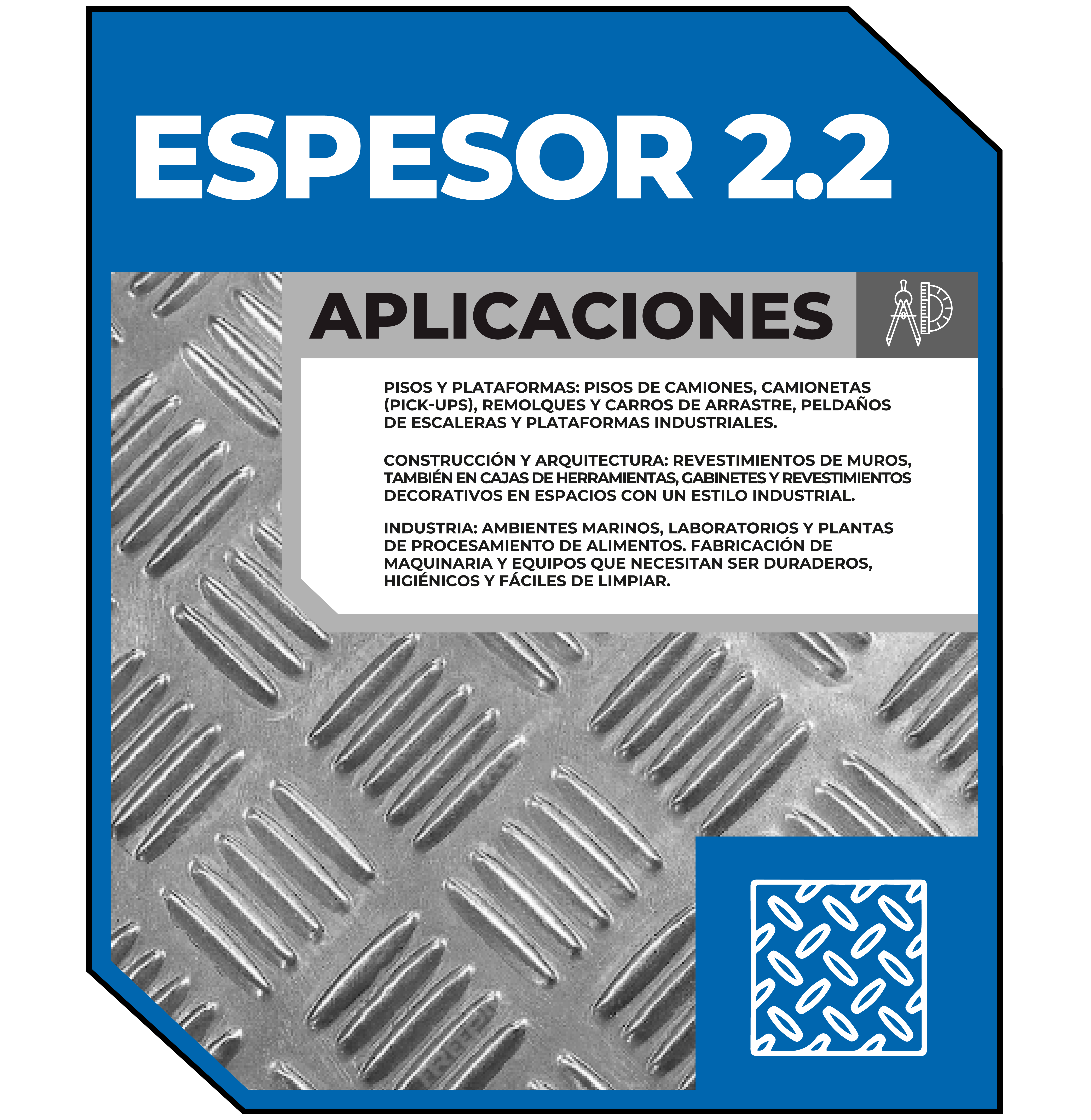 El aluminio diamantado de 2.2 mm es una opción robusta y versátil para una amplia gama de aplicaciones donde se requiere resistencia y tracción.